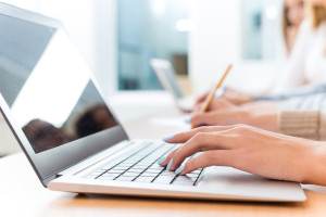 close up of female hands on the laptop keyboard